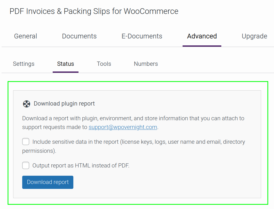 Path: WooCommerce > PDF Invoices > Advanced > Status > Download plugin report.