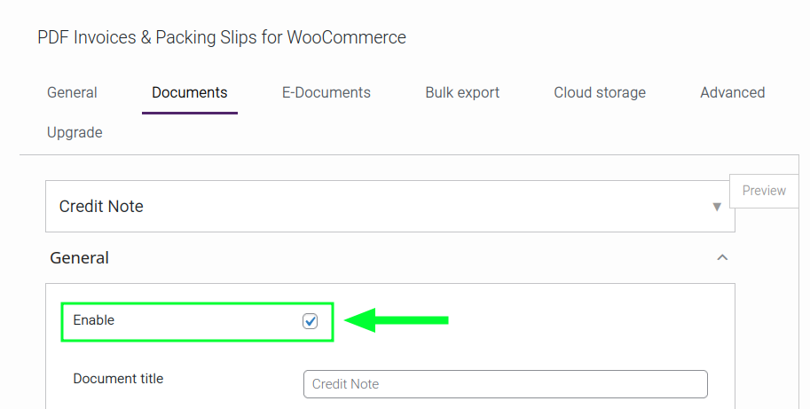 - The document type to be enabled at WooCommerce > PDF Invoices > Documents > Credit Note > Enable.