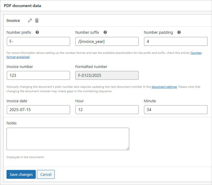 A preview of the generated document number can be seen under the locked “Formatted number” input textbox.