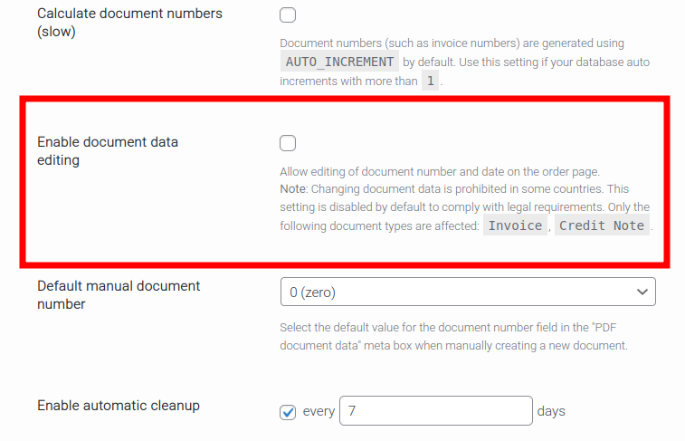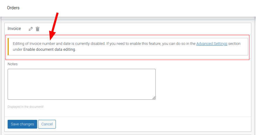 “Editing of invoice number and date is currently disabled. If you need to enable this feature, you can do so in the Advanced settings section under Enable document data editing.”