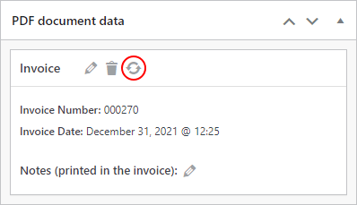 Or for a single order at a time: just click the icon indicated below, inside the order details page from the admin side, and the individual PDF will be regenerated following the last plugin settings.