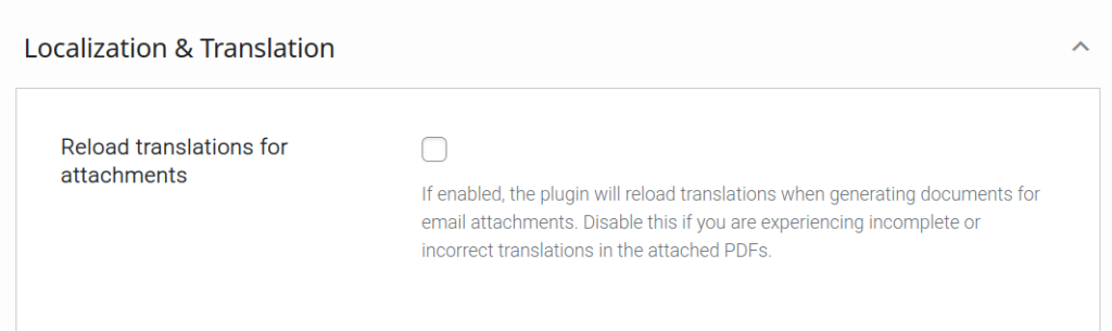 Path: WooCommerce > PDF Invoices > Advanced > Localization & Translation > Reload translations for attachments.
